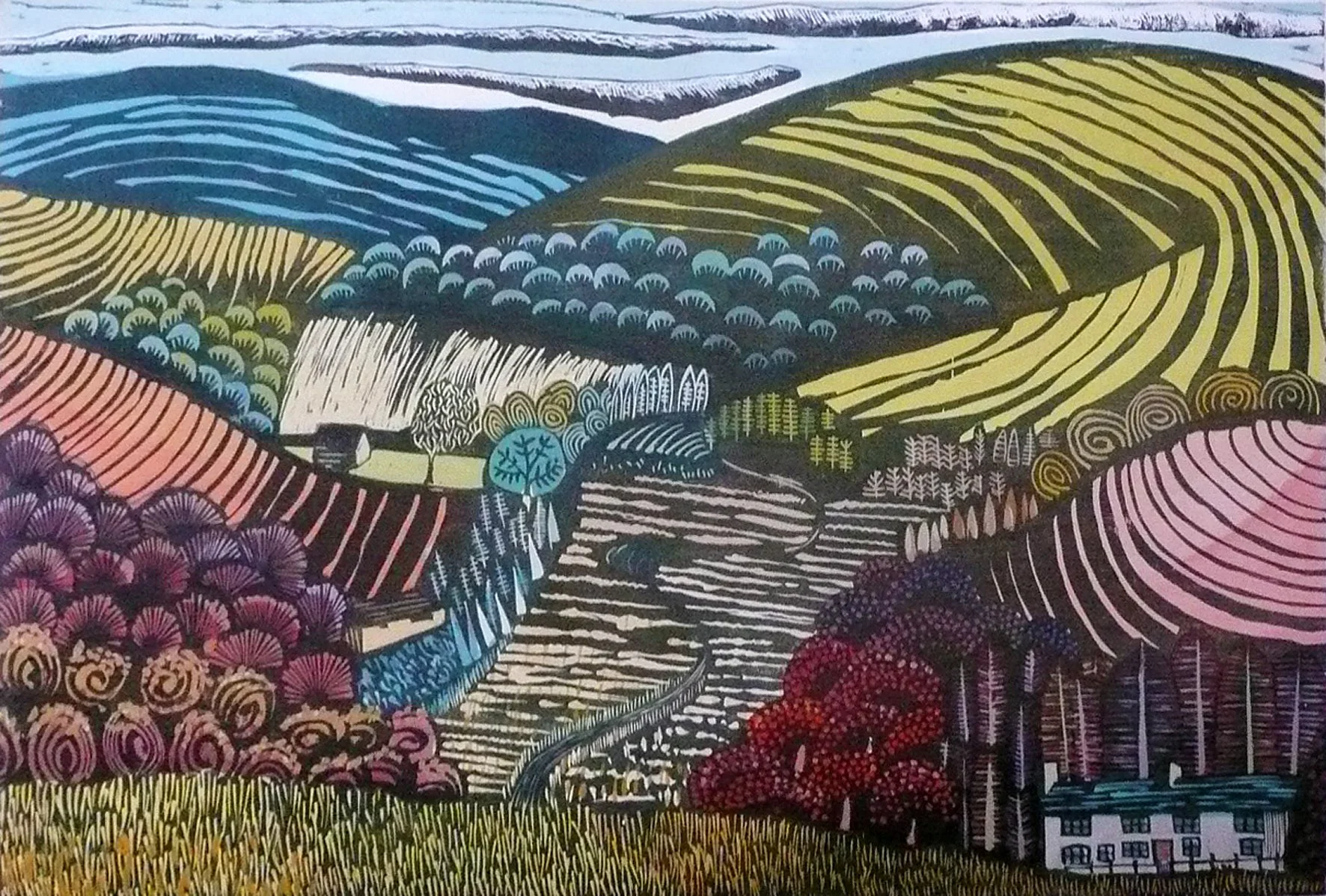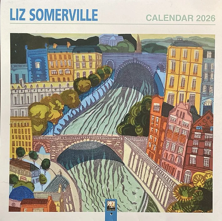 Over the years Liz has developed her style of printmaking, combining a lino- or woodcut printed keyline (a boundary line that separates areas of colour as well as adding definition and texture) with painted blocks of colour. Her work can be viewed in galleries and exhibitions across the UK.